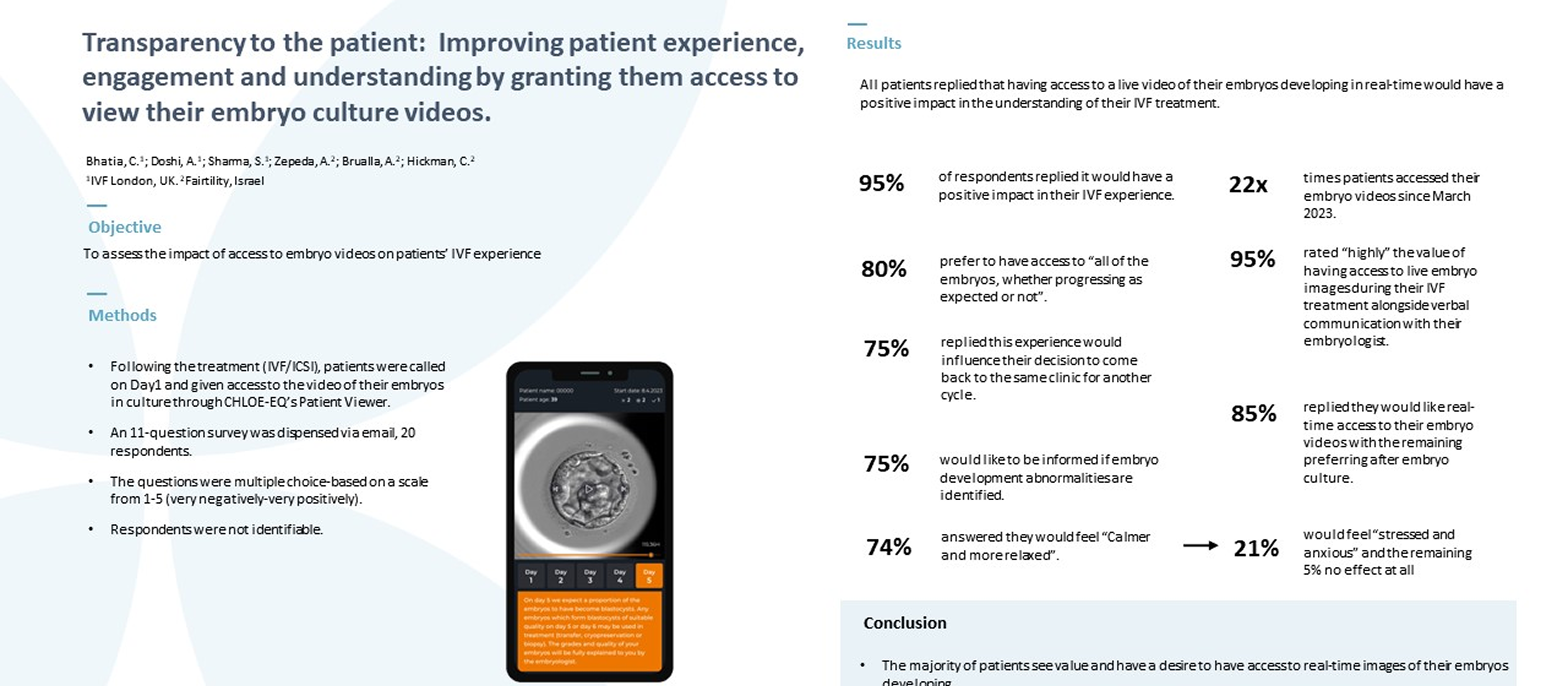 Embryo Assist AI has been validated through extensive testing and peer-reviewed studies to demonstrate its accuracy and effectiveness as a decision support tool for embryologists. Research about CHLOE has been published in several peer reviewed journals, such as Human Reproduction, and Fertility & Sterility, and there are over 80 abstracts that have been presented at leading congresses including ESHRE, ASRM, etc.